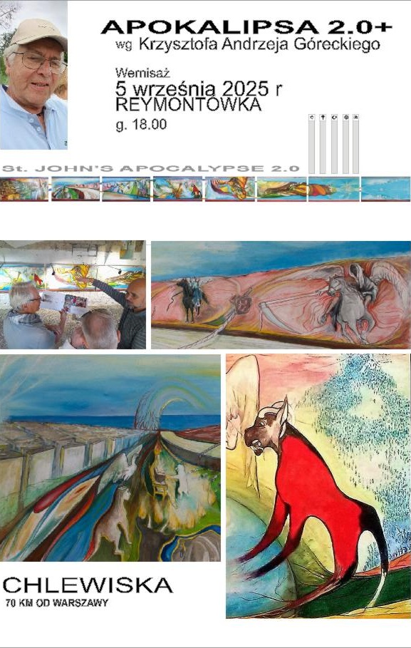 Dom Pracy Twórczej „Reymontówka” rozpoczyna swój jesienny sezon kulturalny wystawą malarstwa olejnego pod tytułem: „APOKALIPSA 2.0+” – czyli przepowiednia św. Jana wg Krzysztofa Andrzeja Góreckiego – artysty z Warszawy, który osiedlił się w pobliżu, w Żeliszewie Dużym, gdzie tworzy tam, od kilku lat kolejne obrazy, inspirowany mitologią słowiańską.